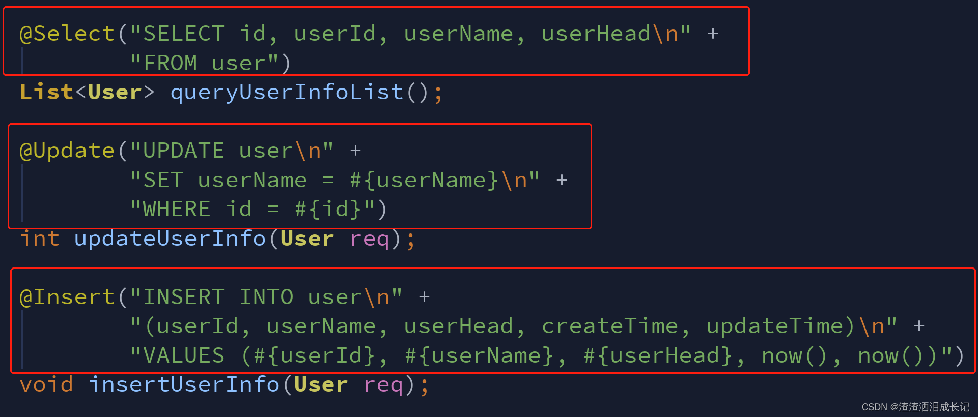 这一章节从题目中也看出来我们要支持注解版的增删改查,可以在Mapper层的接口类的方法上写Sql语句,如:Insert,Update,Delete,Select的这几个基础Sql,如下图,这样就不用在Xml里去写Sql了,但是这就引申出一个问题,我们怎么解析注解的Sql语句,将方法上的SQL内容取出来并按之前的既定流程去处理执行Sql呢?