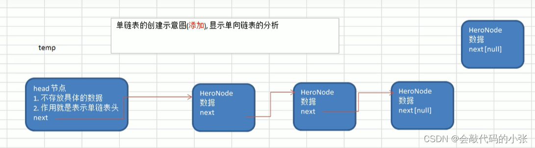 1.添加:①先创建一个head节点,作用表示单链表的头②每增加一个节点,直接加到链表的后面
