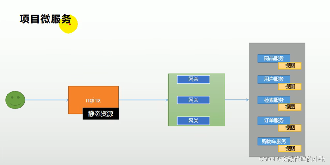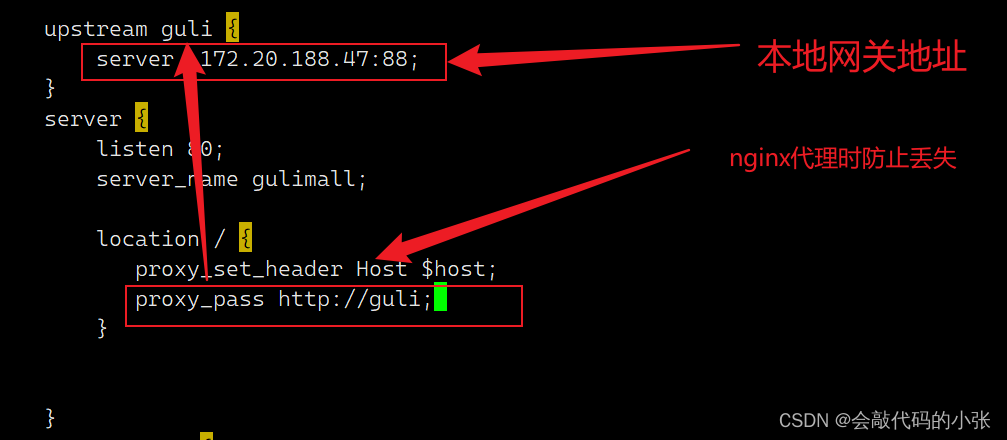 在host文件配置gulimall映射的虚拟机地址,虚拟机中安装了nginx,默认访问80端口,这个端口专门监听gulimall域名,然后nginx会代理到网关,(在代理到网关的过程中会丢失Host头),网关根据陆游规则,匹配到具体的服务