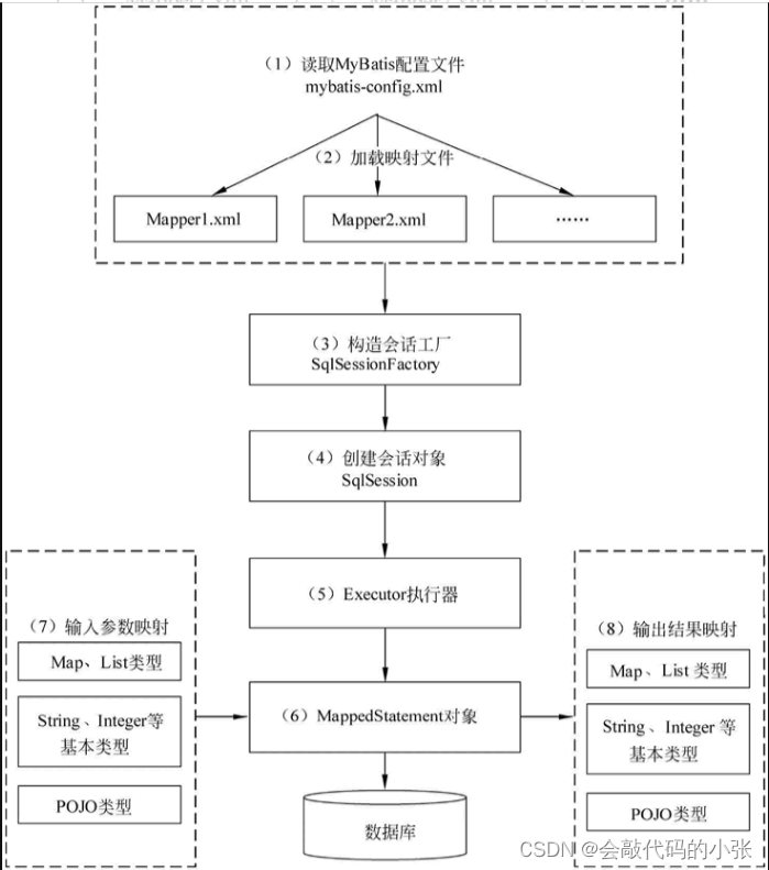 - 1.读取 MyBatis 配置文件——mybatis-config.xml 、加载映射文件——映射文件即 SQL 映射文件,文件中配置了操作数据库的 SQL 语句。最后生成一个配置对象。