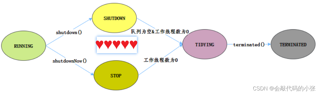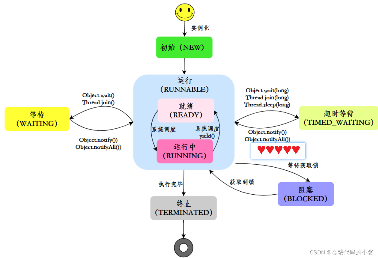 - 1.NEW:初始状态:线程被创建,但还没有调用 start()方法
