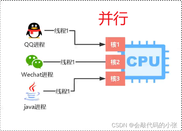 - 并行:多个处理器同时执行多个任务,每个核心实际上可以在同一时间独立地执行不同的任务。