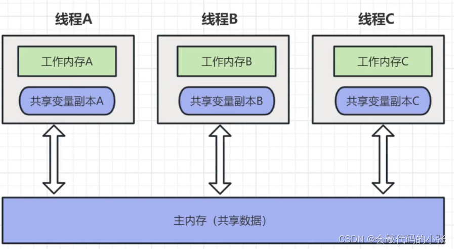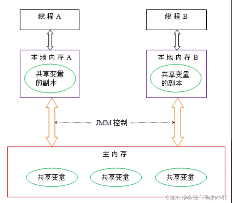 - 线程之间的共享变量存储在主内存(main memory)中,每个线程都有一个私有的本地内存(local memory),本地内存中存储了共享变量的副本。