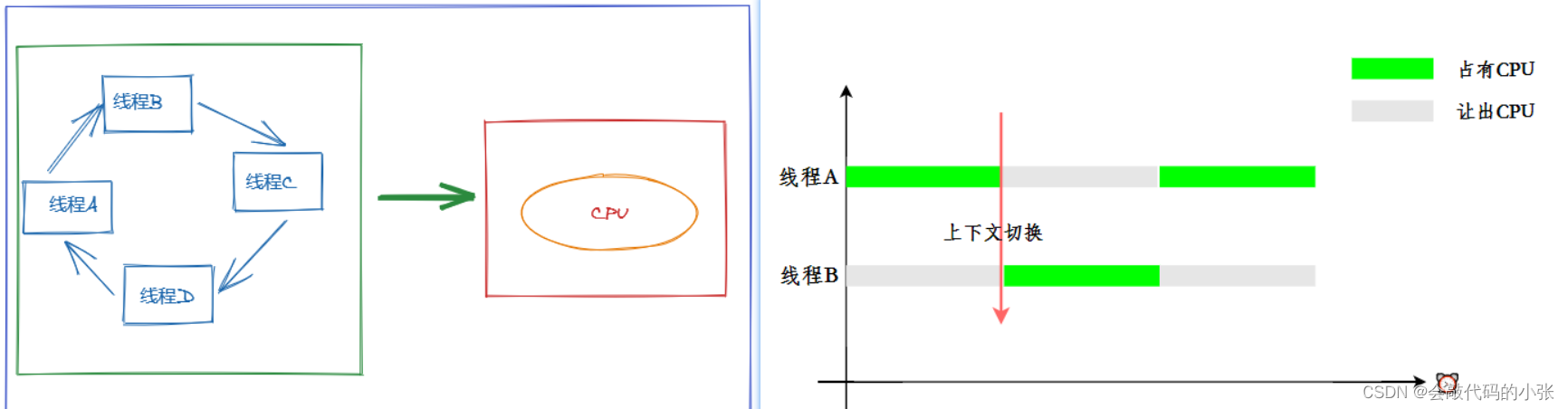 - 让用户感觉多个线程是在同时执行的,CPU 资源的分配采用了时间片轮转也就是给每个线程分配一个时间片,线程在时间片内占用 CPU 执行任务。当线程使用完时间片后,就会处于就绪状态并让出 CPU 让其他线程占用,这就是上下文切换。
