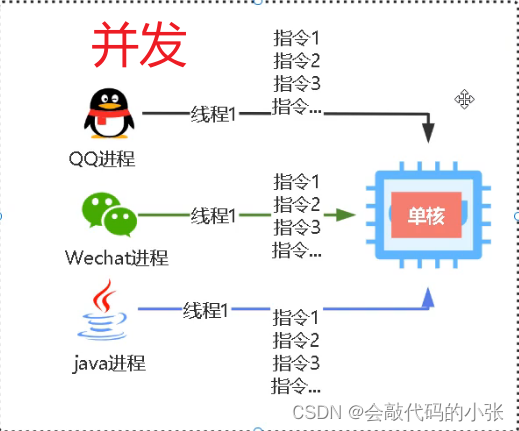 - 并发:系统有处理多个任务的能力,但是任意时刻只有一个任务在执行。