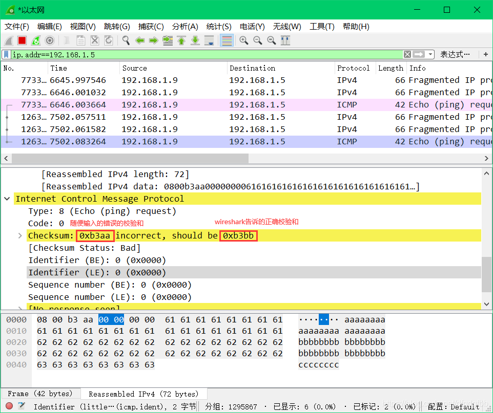 随便输入一个校验和,用wireshark抓包如:输入校验和为0xb3aa发包,wireshark会告诉你正确的校验和为0xb3bb