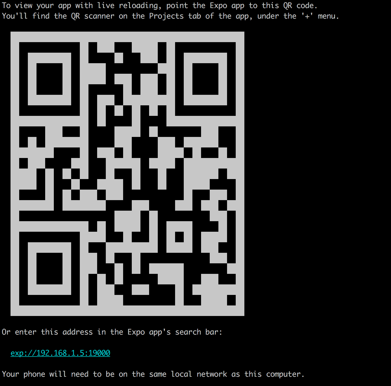命令行中会输出如下界面,我们可以在 Expo 移动端应用中扫描二维码,即可以开始远程调试: