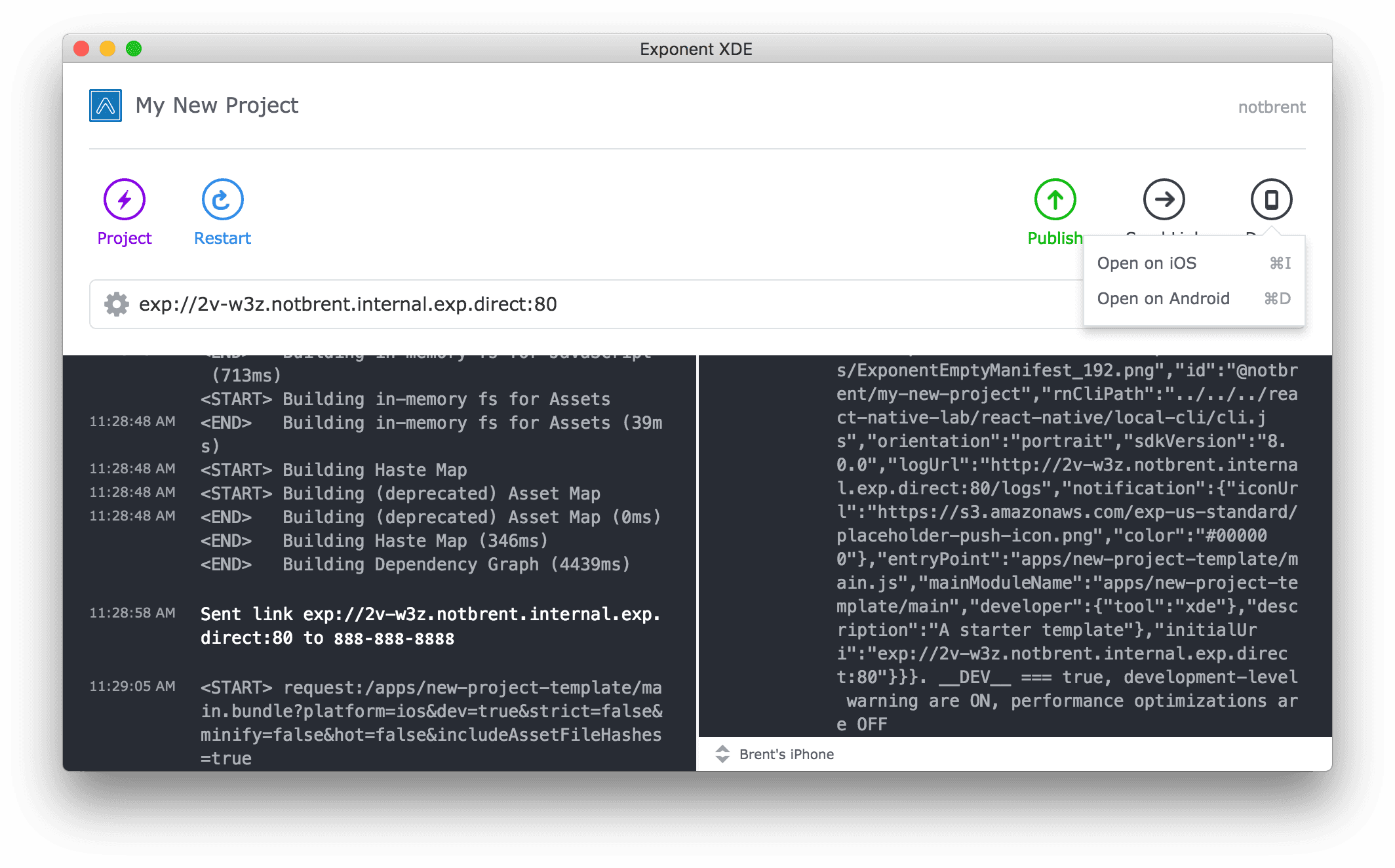 配置完毕之后在应用目录内使用 exp start 命令来启动 Expo 打包工具,然后选择使用 exp build:android 或者 exp build:ios 分别构建 Android 或者 iOS 独立应用。