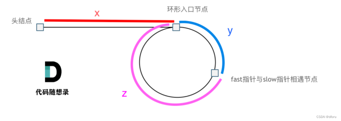 此时,慢指针走过的距离为x+y,快指针走过的距离为x+y+n(y+z)