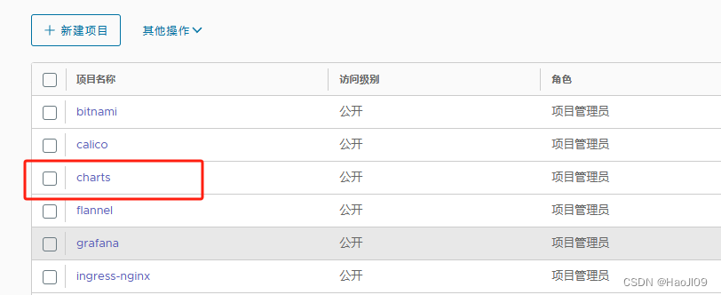 提前在harbor仓库创建charts项目,这个仓库专门存放chart包