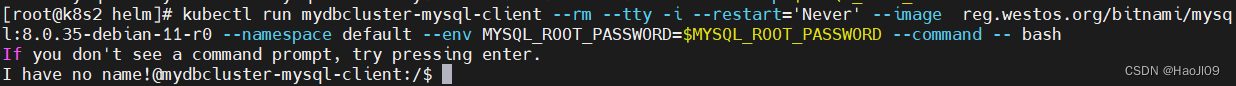 [root@k8s2 helm]# kubectl run mydbcluster-mysql-client --rm --tty -i --restart='Never' --image reg.westos.org/bitnami/mysql:8.0.35-debian-11-r0 --namespace default --env MYSQL_ROOT_PASSWORD=$MYSQL_ROOT_PASSWORD --command -- bash