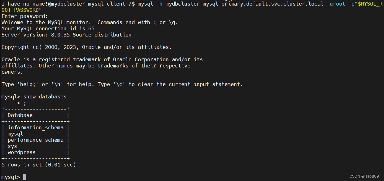 I have no name!@mydbcluster-mysql-client:/$ mysql -h mydbcluster-mysql-primary.default.svc.cluster.local -uroot -p"$MYSQL_ROOT_PASSWORD"