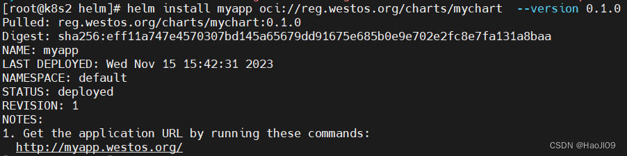 [root@k8s2 helm]# helm install myapp oci://reg.westos.org/charts/mychart --version 0.1.0