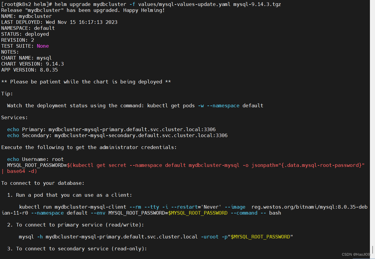 [root@k8s2 helm]# helm upgrade mydbcluster -f values/mysql-values-update.yaml mysql-9.14.3.tgz
