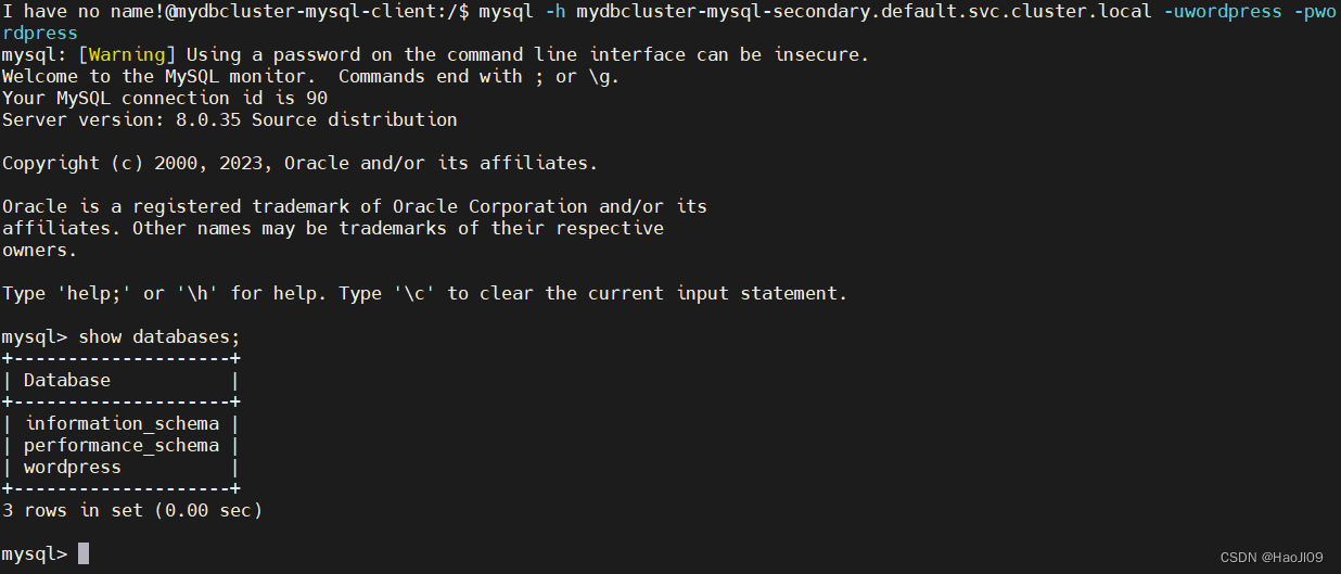 I have no name!@mydbcluster-mysql-client:/$ mysql -h mydbcluster-mysql-secondary.default.svc.cluster.local -uwordpress -pwordpress