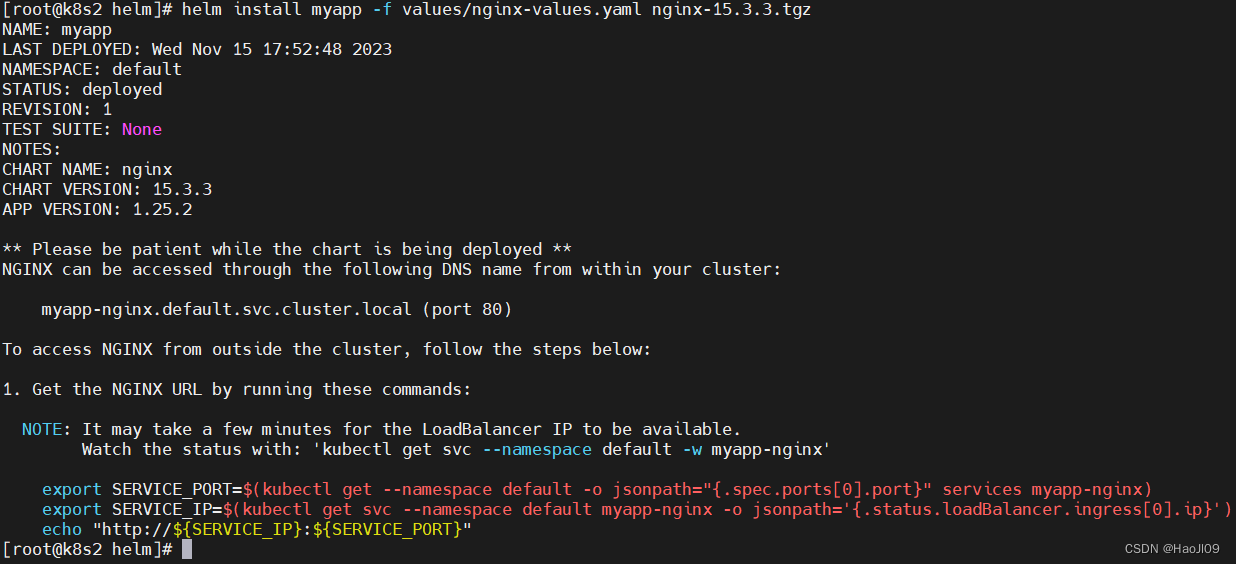 [root@k8s2 helm]# helm install myapp -f values/nginx-values.yaml nginx-15.3.3.tgz