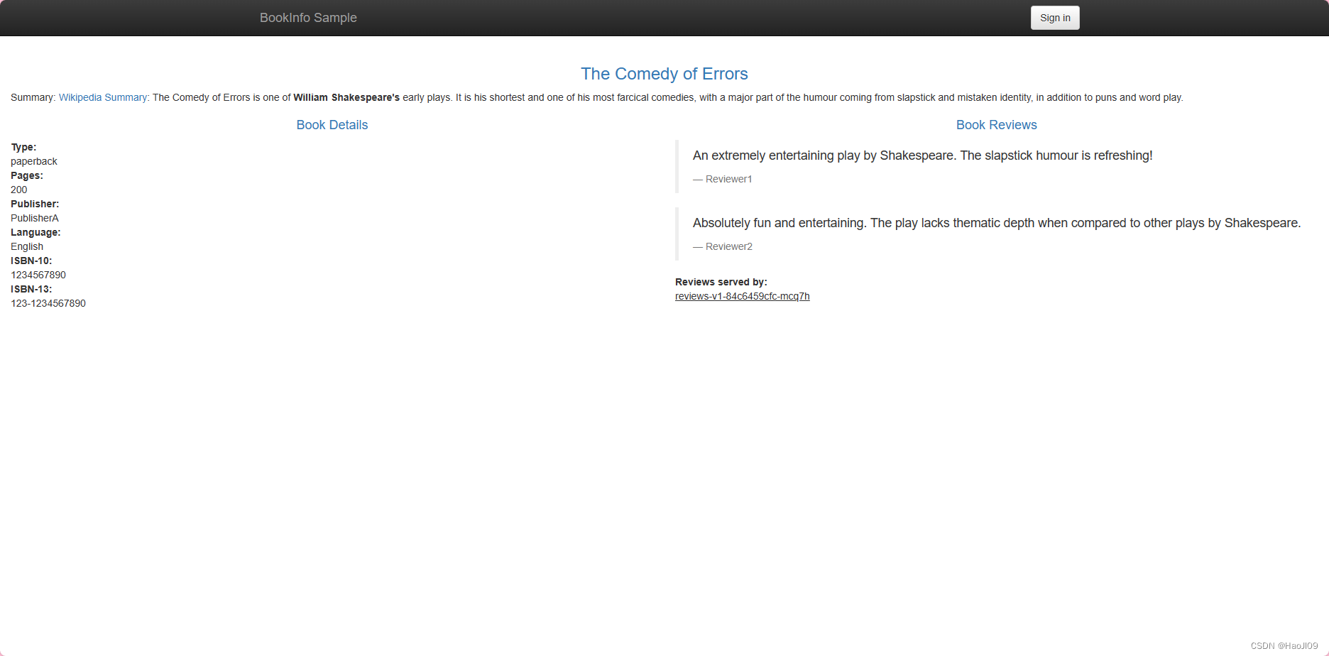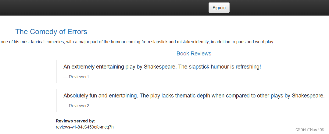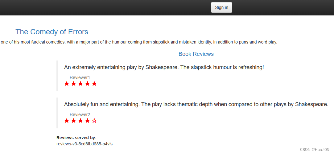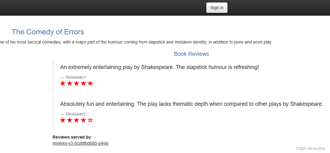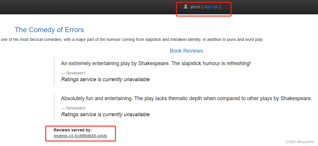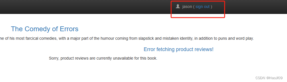 用户 jason 登陆到 /productpage 页面,出现了一个问题:Reviews 部分显示了错误消息