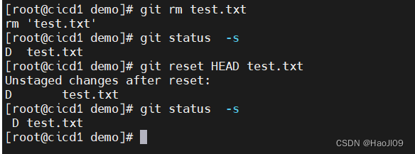[root@cicd1 demo]# git commit -m "delete test.txt"
