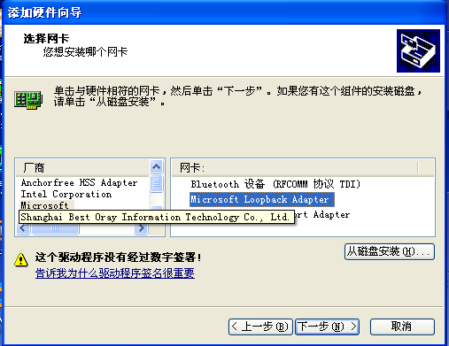 在左边的厂商列表里边选择“Microsoft”,网卡选择“Microsoft Loopback Adapter”,点击下一步最后完成安装。