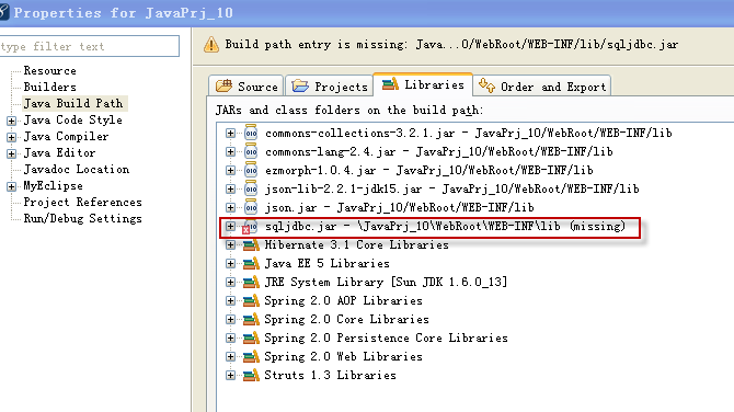 解决办法:在eclipse的工程中点击右健选择properties-->java build path中已经提示了xx.jar不存在,这样就把这个jar信息从Libraries中删除即可.