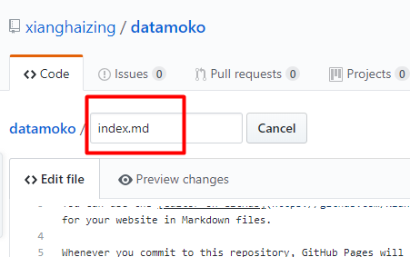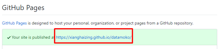 还是在刚才Setting的GitHub Pages中,可以看到访问地址:https://xianghaizing.github.io/datamoko/