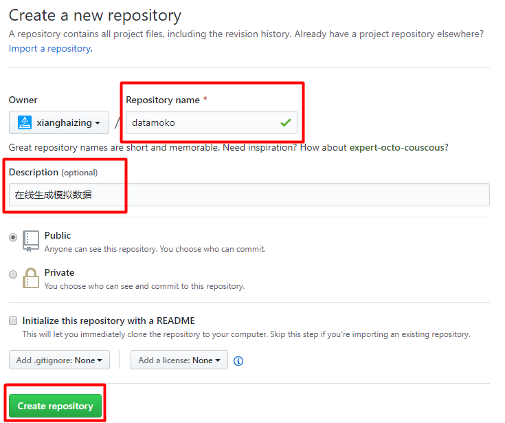添加基本信息: 仓库名、仓库描述,然后点击创建
