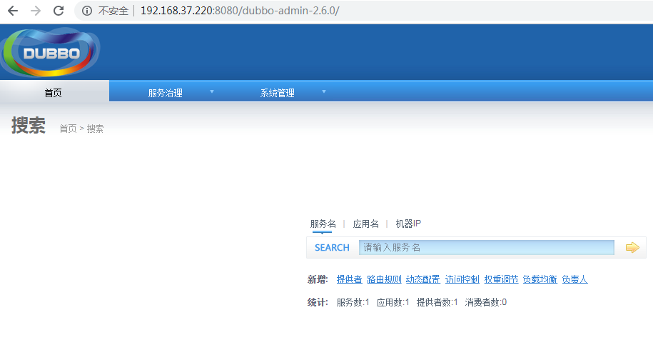 下载 dubbo-admin-2.6.0.war, 放在/apache-tomcat-8.5.34/webapps 目录下,启动tomcat服务,浏览器访问:http://192.168.37.220:8080/dubbo-admin-2.6.0/ (修改成自己ip进行访问),用户名root 密码root