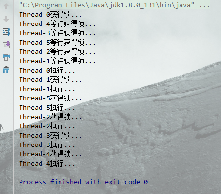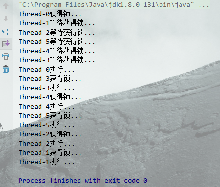 线程0获得锁, 线程 1 2 5 4 3 依次进入等待状态,在线程0执行完后,按照 顺序 3 4 5 2 1 执行.