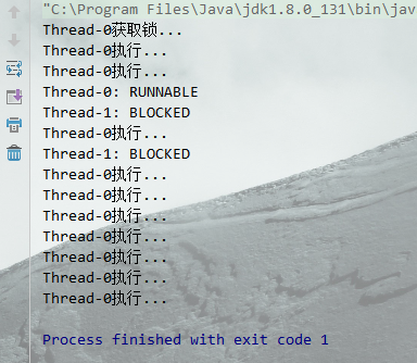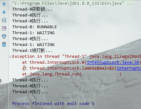 线程0获取锁后, 线程1进入阻塞等待状态.对线程1调用interrupt()打断线程,发现没什么用!线程1还是在等待.