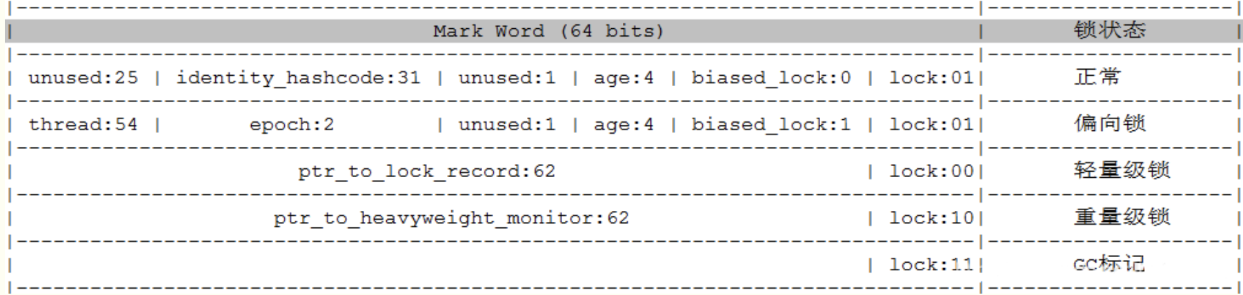 |-------------------------------------------------------|--------------------| | Mark Word (32 bits) | State | |-------------------------------------------------------|--------------------| | identity_hashcode:25 | age:4 | biased_lock:1 | lock:2 | Normal | |-------------------------------------------------------|--------------------| | thread:23 | epoch:2 | age:4 | biased_lock:1 | lock:2 | Biased | |-------------------------------------------------------|--------------------| | ptr_to_lock_record:30 | lock:2 | Lightweight Locked | |-------------------------------------------------------|--------------------| | ptr_to_heavyweight_monitor:30 | lock:2 | Heavyweight Locked | |-------------------------------------------------------|--------------------| | | lock:2 | Marked for GC | |-------------------------------------------------------|--------------------|- 64位系统中