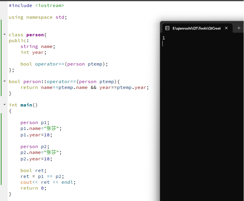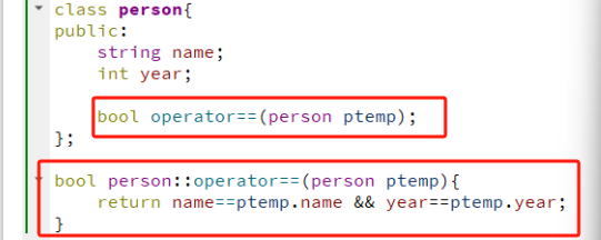 这个 bool operator==(person ptemp);这个就是函数的声明了 这个 operator==就是编译器给我们的标准写法,进行运算符重载的标准写法,当然我们这边是==因为是比较真假的,也有+ - 等等,然后这个参数的话是类型是类,因为我们的数据都在类里,我们类的对象里