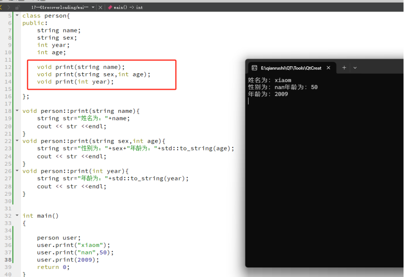 比如看这个 我的类里面写上了三个一样的名字的叫做print的函数,但是功能都是不一样的,一个是输出名字,一个是输出性别和年龄,一个是输出年龄,代码就不讲了大家都会