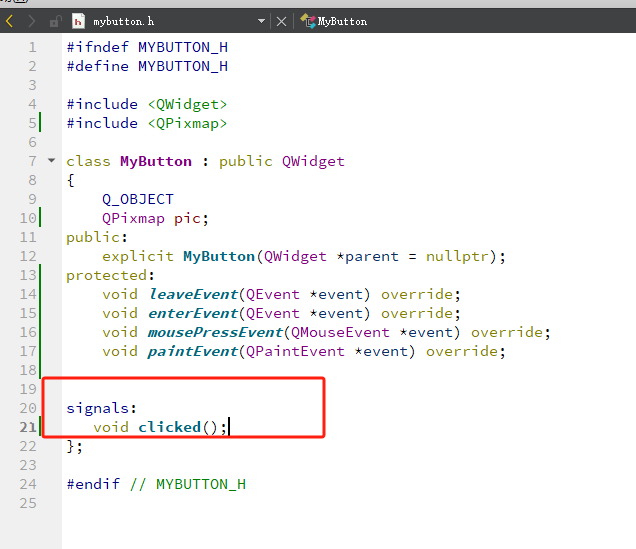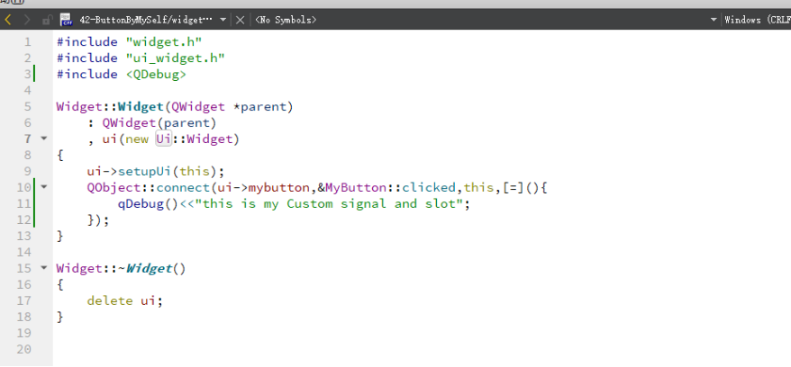 我们在这个MyButton类这边将信号定义出来,在这个Widget将信号与槽进行绑定,那么为什么呢。因为我们的Mybutton这个控件是发信号的,我们这个Widget是捕获信号的,所以,而且我们这个需要使用ui->mybutton 这个只有Widget构造函数中才有的,创建了ui指针