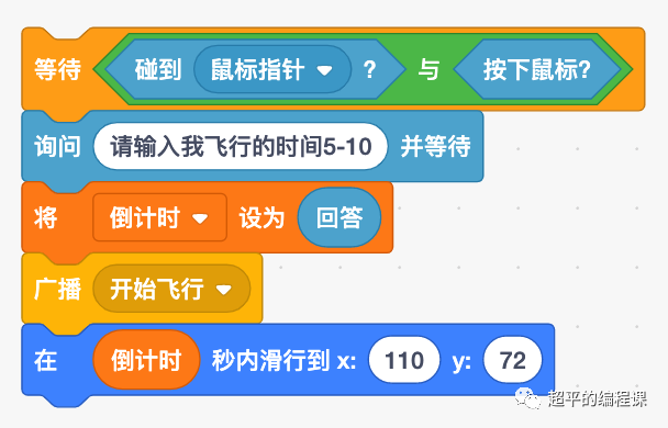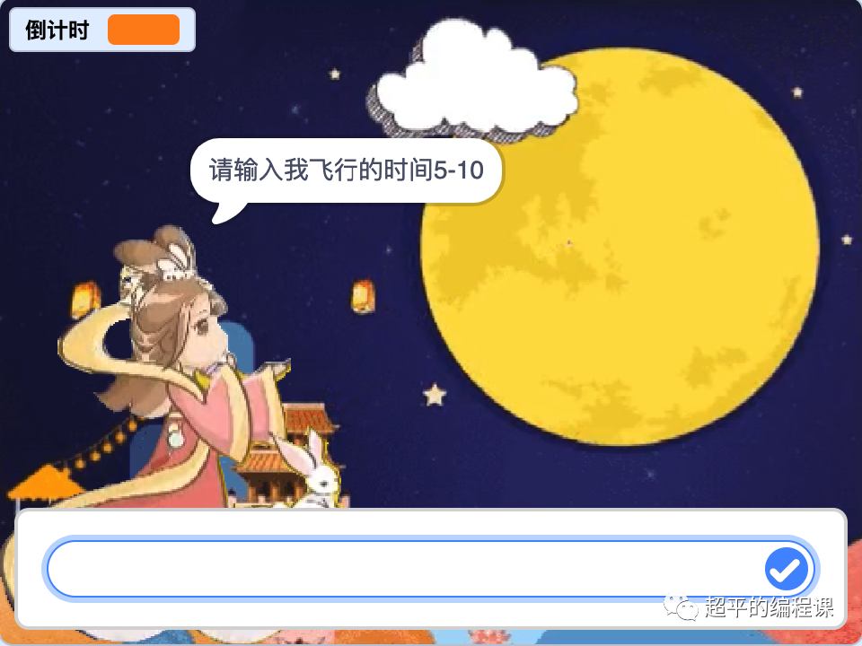 当玩家输入飞行时间后,将变量“倒计时”设为回答,然后发送了一个广播消息,接着让嫦娥角色在指定时间内滑行到月亮上。