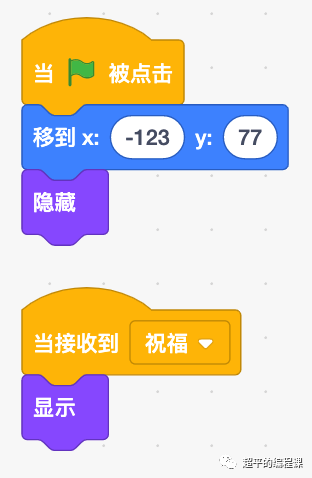 倒计时减到0,再等1秒,出现节日祝福,因此在这里发送了一个“广播祝福”的广播消息,对应的,祝福角色在接收到广播后,将自己显示出来,切换到祝福角色,编写代码如下: