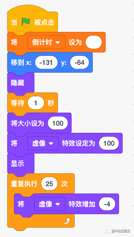 需要说明一下,这里的嫦娥在出现的时候,有渐显效果,在Scratch编程中,我们可以通过逐渐改变虚像特效来实现。