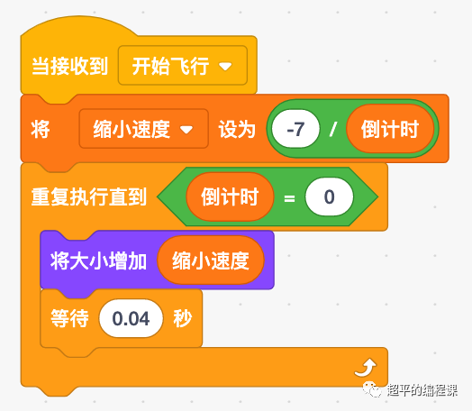 嫦娥角色接收到自己发送的“开始飞行”广播后,逐渐开始变小,根据前面的思路分析,我们添加一个变量“缩小速度”,它和“倒计时”变量成反比关系,然后重复减小角色直到倒计时为0,对应的代码如下: