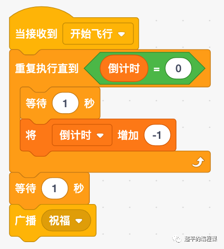 嫦娥角色在接收到“开始飞行”广播后,还需要显示倒计时效果,每隔1秒就减去1,当倒计时减到0,在嫦娥角色中继续编写代码如下: