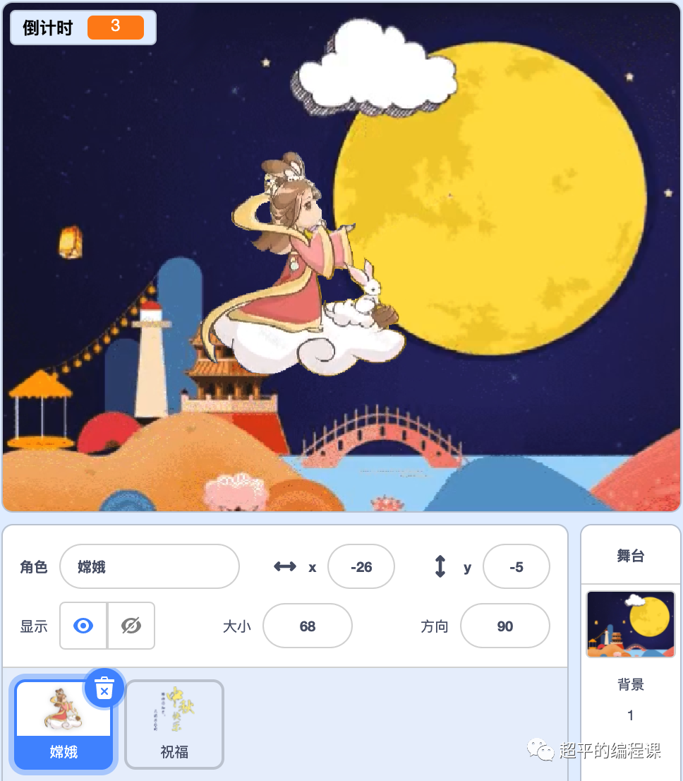 嫦娥奔月,本题是2021年10月23日举行的第13届蓝桥杯Scratch选拔赛真题编程第3题,初级组和中级组都有此题,题目要求编程模拟嫦娥奔月的效果。