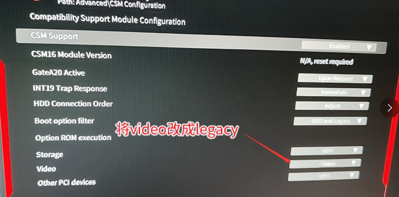 若开启CSM仍卡LOGO,需将BIOS中的"Video模式"改为: