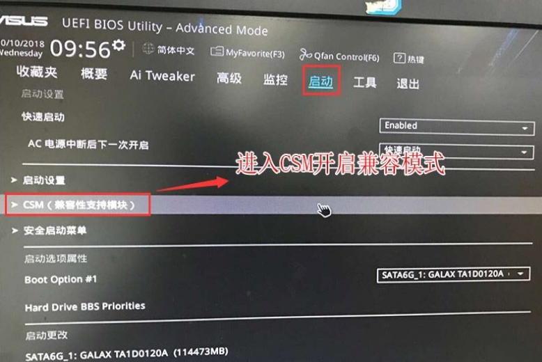 3、再返回到"启动"的选项,把CSM由disabled改成enabled,开启兼容模式,如下图所示;
