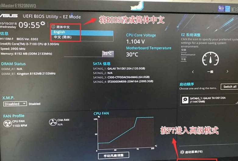 1、重启电脑按esc或f8进入BIOS设置,将bios改成简体中文,然后按F7进入高级模式,如下图所示;