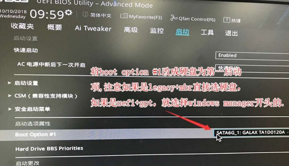 4,继续把boot option#1选项改为普通引导的,设置第一启动项为普通硬盘引导,如果采用的是uefi+gpt的就要选带Windwos Boot Manager的为UEFI引导分区,如果是legacy+mbr方式安装的,选择硬盘为第一启动,然后F10保存设置,如下图所示;