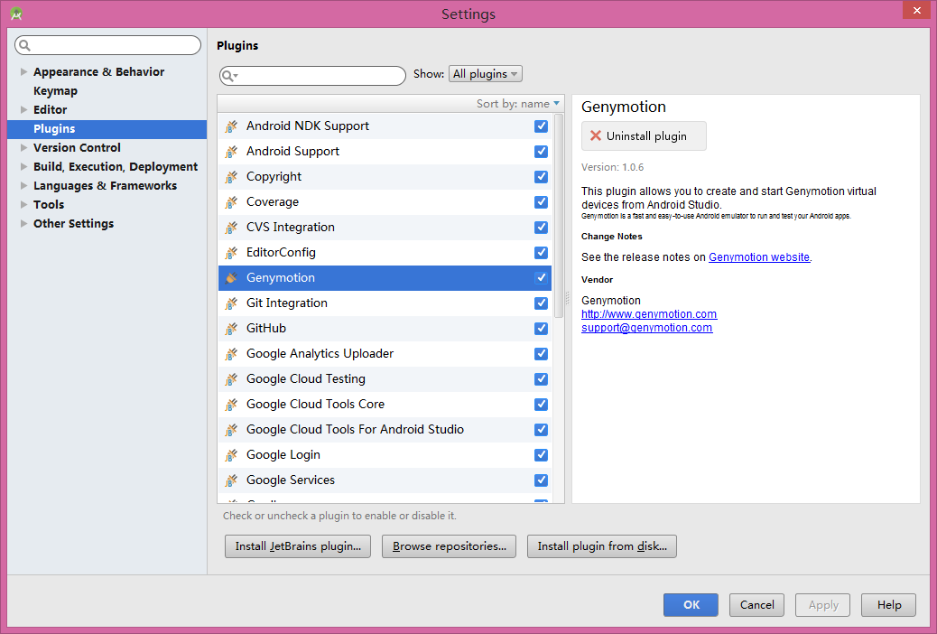 打开Android Studio,File-Settings,搜索Genymotion,点击安装。