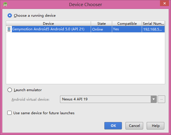 启动Android Studio项目,提示选择设置,我们选择正在运行的Genymotion模拟器,OK即可。