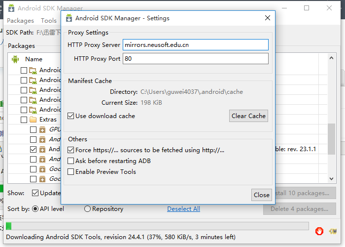 有时候如果还不能更新,说明当前网络把google sdk的地址也给枪了,这时我们可以设置代理来下载。