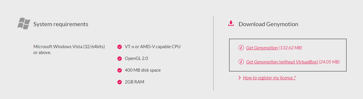 先去http://www.genymotion.net/注册一个账号,然后在Shop里下载模拟器,选择Free版本(For personal use only),有钱也可以选择其它版本。