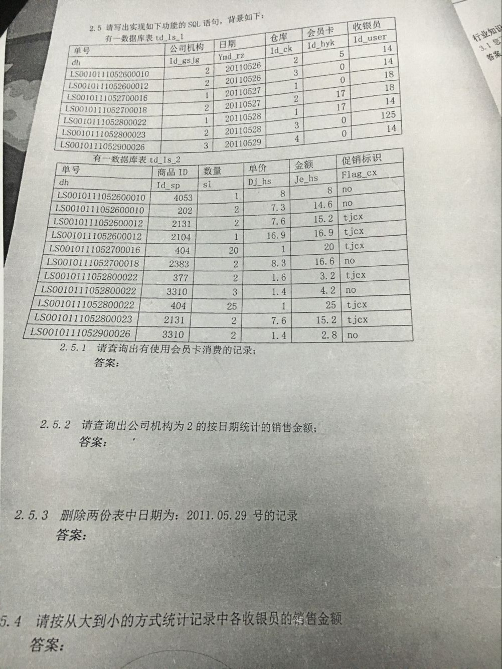 if OBJECT_ID('td_ls_2') is not null drop table td_ls_2 go if OBJECT_ID('td_ls_1') is not null drop table td_ls_1 go create table td_ls_1 ( dh varchar(18) primary key, Id_gsjg int, Ymd_rz varchar(8), Id_ck int, Id_hyk int, Id_user int ) go create table td_ls_2 ( dh varchar(18) foreign key references td_ls_1(dh), Id_sp int, sl int, Dj_hs decimal(10,1), Je_hs decimal(10,1), Flag_cx varchar(4) ) go insert into td_ls_1 values('LS0010111052600010',2,'20110526',2,5,14); insert into td_ls_1 values('LS0010111052600012',2,'20110526',3,0,14); insert into td_ls_1 values('LS0010111052700016',1,'20110527',1,0,18); insert into td_ls_1 values('LS0010111052700018',2,'20110527',2,17,18); insert into td_ls_1 values('LS0010111052800022',1,'20110528',1,17,14); insert into td_ls_1 values('LS0010111052800023',2,'20110528',3,0,125); insert into td_ls_1 values('LS0010111052900026',3,'20110529',4,0,14); go insert into td_ls_2 values('LS0010111052600010',4053,1,8,8,'no'); insert into td_ls_2 values('LS0010111052600010',202,2,7.3,14.6,'no'); insert into td_ls_2 values('LS0010111052600012',2131,2,7.6,15.2,'tjcx'); insert into td_ls_2 values('LS0010111052600012',2104,1,16.9,16.9,'tjcx'); insert into td_ls_2 values('LS0010111052700016',404,20,1,20,'tjcx'); insert into td_ls_2 values('LS0010111052700018',2383,2,8.3,16.6,'no'); insert into td_ls_2 values('LS0010111052800022',377,2,1.6,3.2,'tjcx'); insert into td_ls_2 values('LS0010111052800022',3310,3,1.4,4.2,'no'); insert into td_ls_2 values('LS0010111052800022',404,25,1,25,'tjcx'); insert into td_ls_2 values('LS0010111052800023',2131,2,7.6,15.2,'tjcx'); insert into td_ls_2 values('LS0010111052900026',3310,2,1.4,2.8,'no');