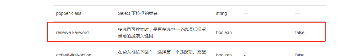 我们在element 2.x.x的版本的官方文档中可以发现el-select组件的属性中比1.x.x的版本多了很多新的属性,其中的reserve-keyword属性,正好是客户想要实现的效果。