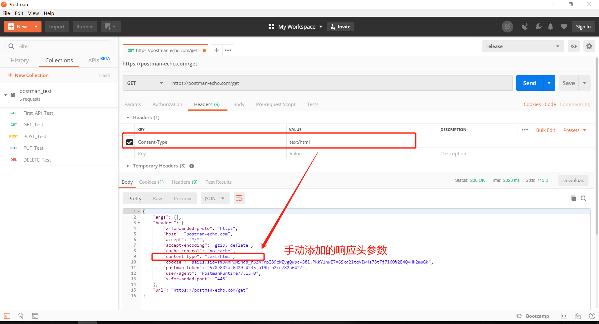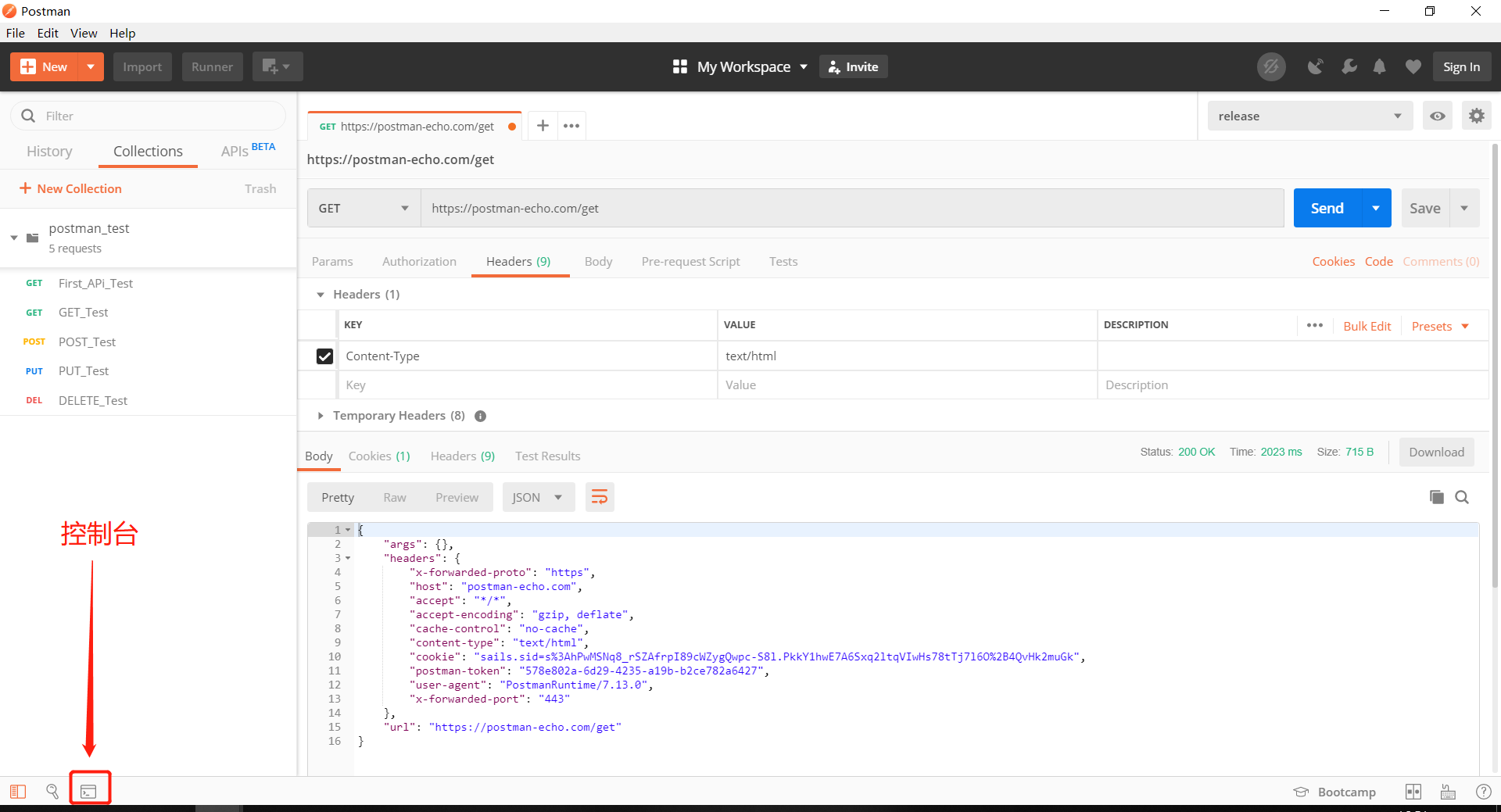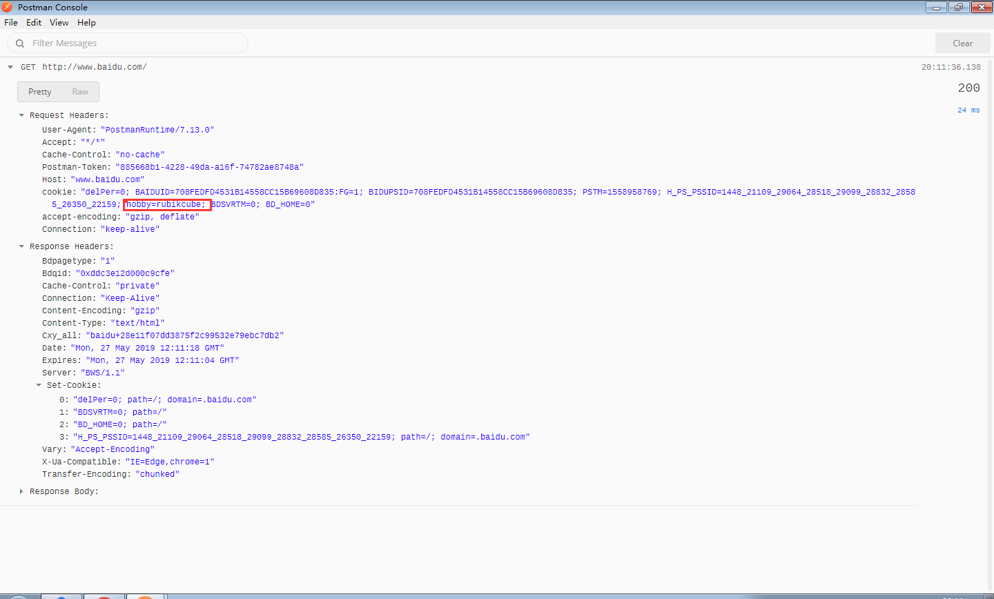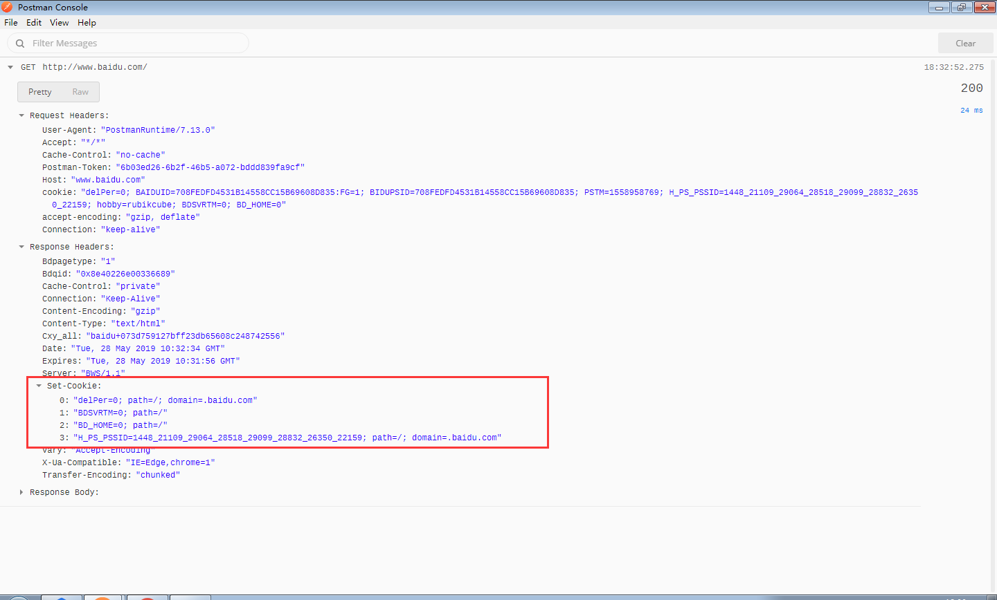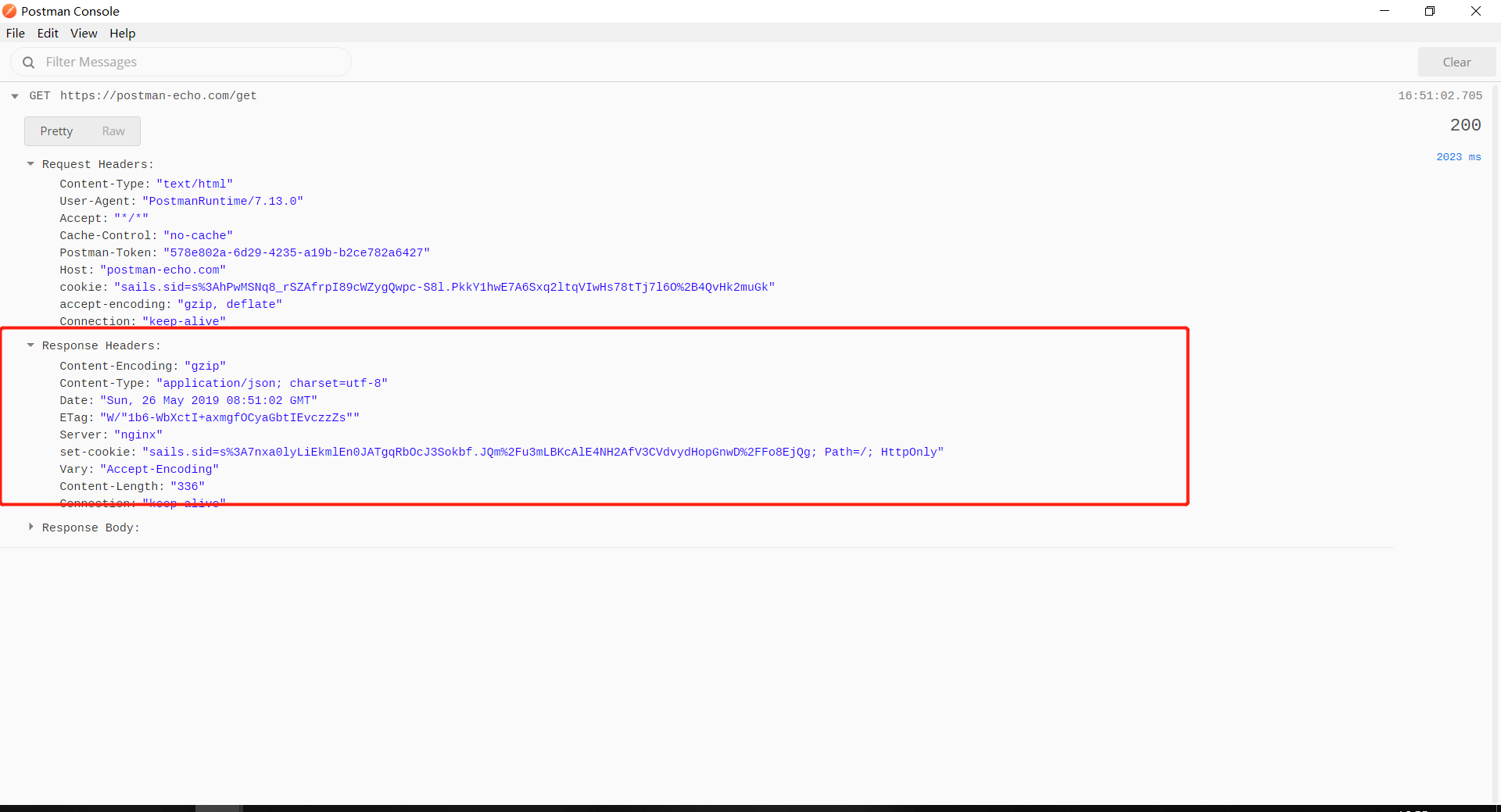 响应头-其中包含了服务器对请求的应答信息,如Content-Type、Server、Set-Cookie等,在postman主界面下方Heerders或者Postman Console界面都可以查看Response Heaader信息